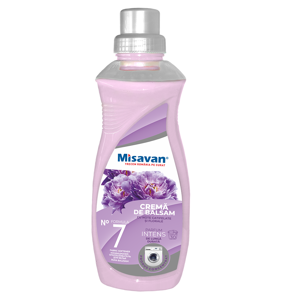 Misavan Crema de Balsam 0,75L No 7 este conceput ca un balsam de rufe concentrat, cu un conținut bogat în substanţe care pătrund uşor în ţesătură, făcând hainele moi și pufoase la atingere.